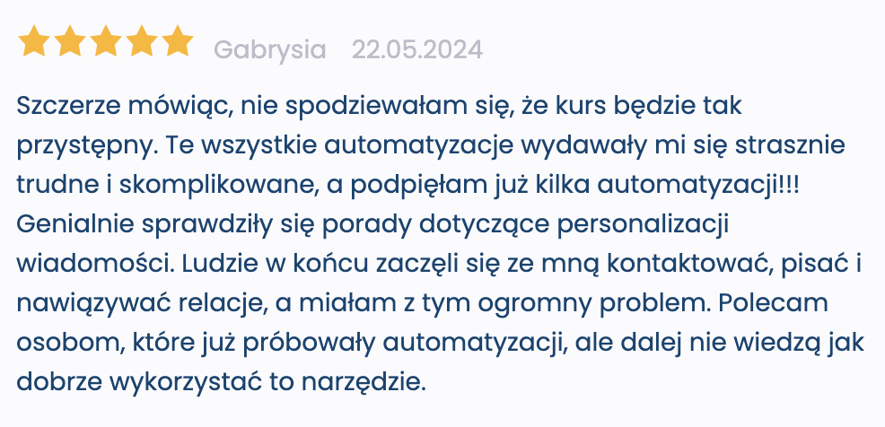 W kursie nauczysz się zaawansowanych technik, pokażę Ci wieloetapowe ścieżki angażowania odbiorcy i klienta. Poczujesz, że Twoja automatyzacja pomaga Ci w przyciągnięciu klienta idealnego, że dzięki niej tworzysz bazę informacji o potrzebach Twojej grupy docelowej. A Twoi Klienci poczują się zaopiekowani, profesjonalnie obsłużeni, przeprowadzeni przez lejek sprzedażowy w niestandardowy sposób oparty na ciekawości, z elementami zabawy w klikanie.
